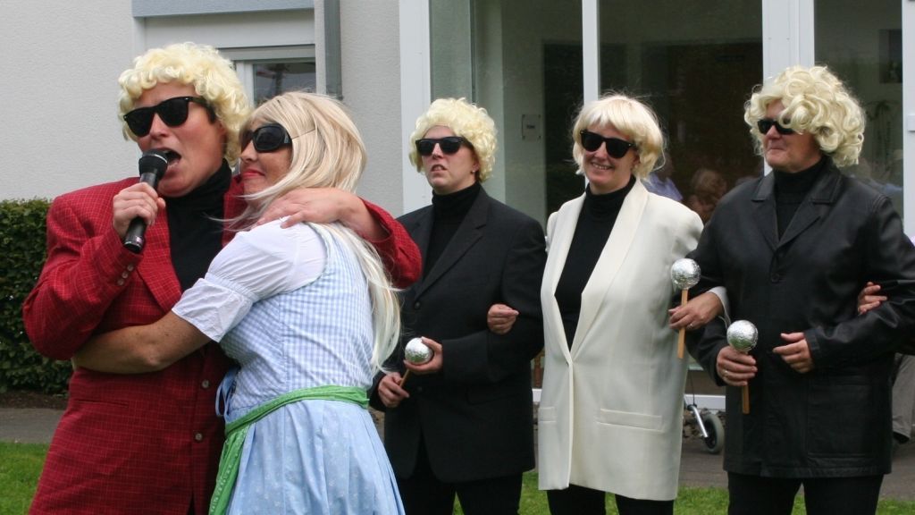 Ausgestattet mit blonden Perücken und Sonnenbrillen, präsentierten die Damen der kfd-Theatergruppe eine Persiflage auf den berühmten Schlagersänger und seine Ehefrau Hannelore. Damit sorgten die Darstellerinnen nicht nur für gute Laune unter den Zuschauern, sondern lösten auch Schunkeln aus; vereinzelt wurde auch getanzt. Für musikalische Unterhaltung sorgte darüber hinaus Peter Greger mit seinem Akkordeon.