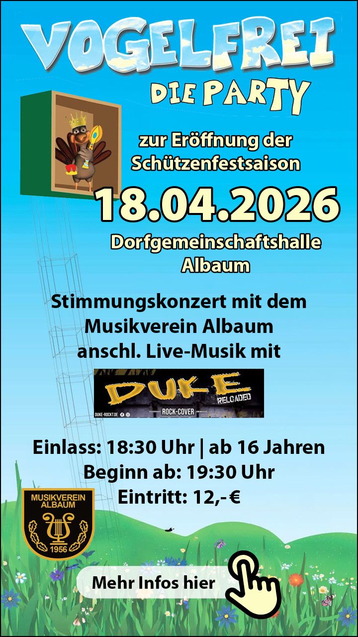 Ausrichter ist wie immer der Musikverein Albaum – und der macht an diesem Abend keine halben Sachen. Um 19.30 Uhr geht’s los (Einlass ab 18.30 Uhr) mit einem Stimmungskonzert, unter der Leitung von Marco Linde, aus bekannten Märschen und neuen Arrangements. Wer wissen will, wie sich die Schützenfestsaison 2026 anhört, bekommt hier die erste Kostprobe.