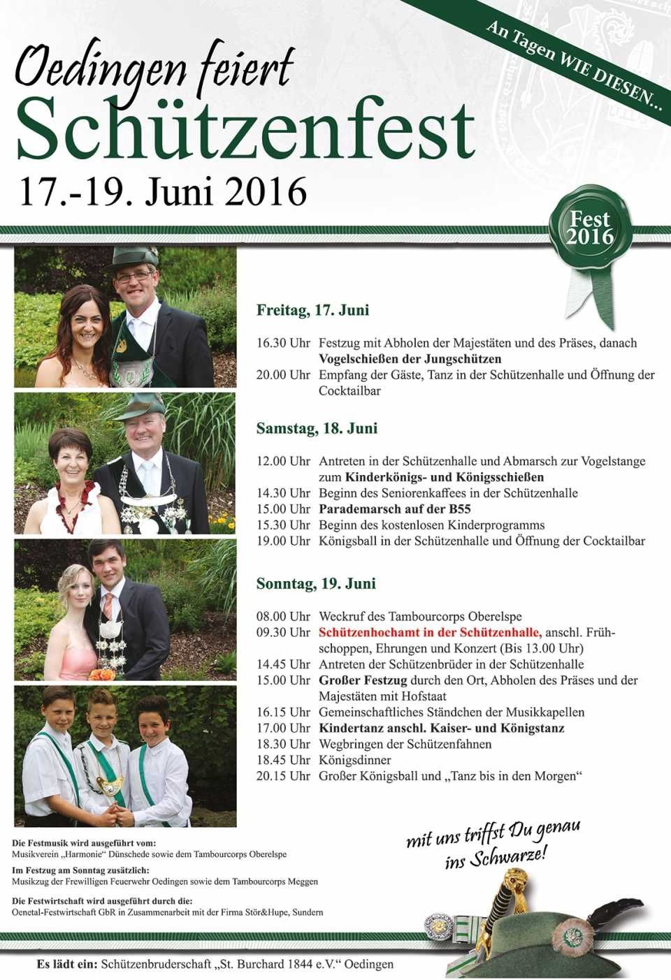Unter dem Motto „An Tagen wie diesen…“ feiert die Schützenbruderschaft Oedingen von Freitag bis Sonntag, 17. Bis 19. Juni, ihr Hochfest.